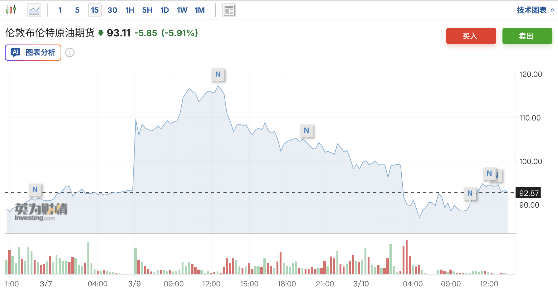 霍尔木兹海峡的实际封锁已令全球能源市场陷入混乱,此前曾推动布伦特原油期货逼近每桶120美元;不过,美国总统特朗普周二暗示战争或将很快结束,期货价格随后大幅回落。截至发稿报价93美元。