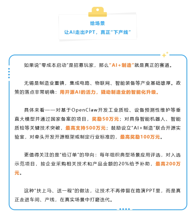 征集意见稿提出,对提供免费部署与开发工具包的本地云平台,给予最高100万元的全额补贴。对使用区内智能算力平台的OPC项目,按实际费用给予补贴,每年每家最高30万元。此外,对基于OpenClaw开发工业质检、设备预测性维护等垂直大模型并通过国家备案的项目,奖励50万元;对具身智能机器人、智能质检等关键技术突破,最高支持500万元;鼓励设立“AI+制造”联合开源实验室,对牵头开发开源框架或制定行业标准的,最高奖励100万元。