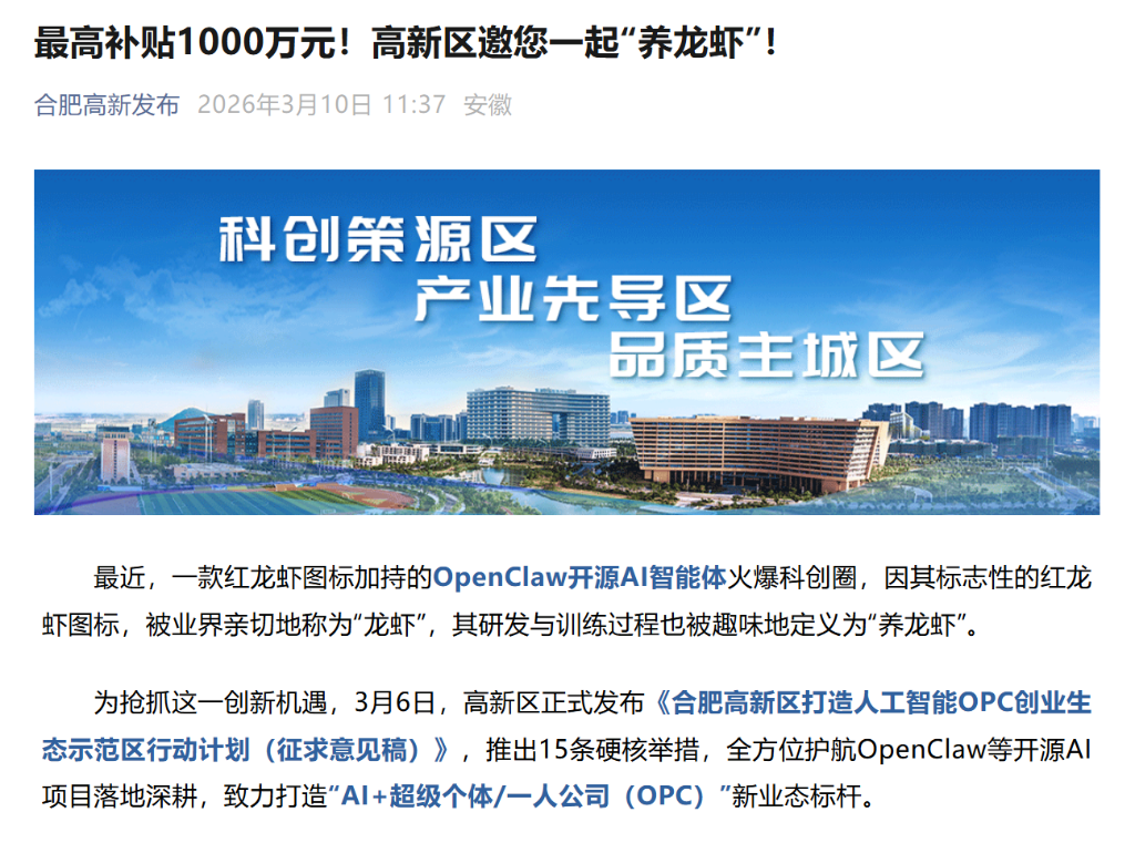 3月6日,合肥高新区发布《打造人工智能OPC创业生态示范区行动计划(征求意见稿)》,推出15条举措,依托安徽人工智能产业先导区与科大硅谷的科创底蕴,构建"空间+人才+算力+场景+资本"全周期支持体系。