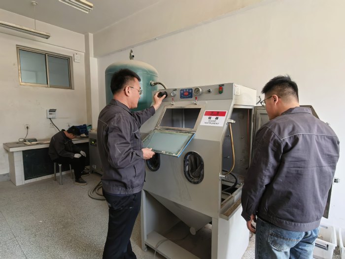 张凯(左)和学生在实验室里进行风沙冲蚀混凝土试验。受访者供图。