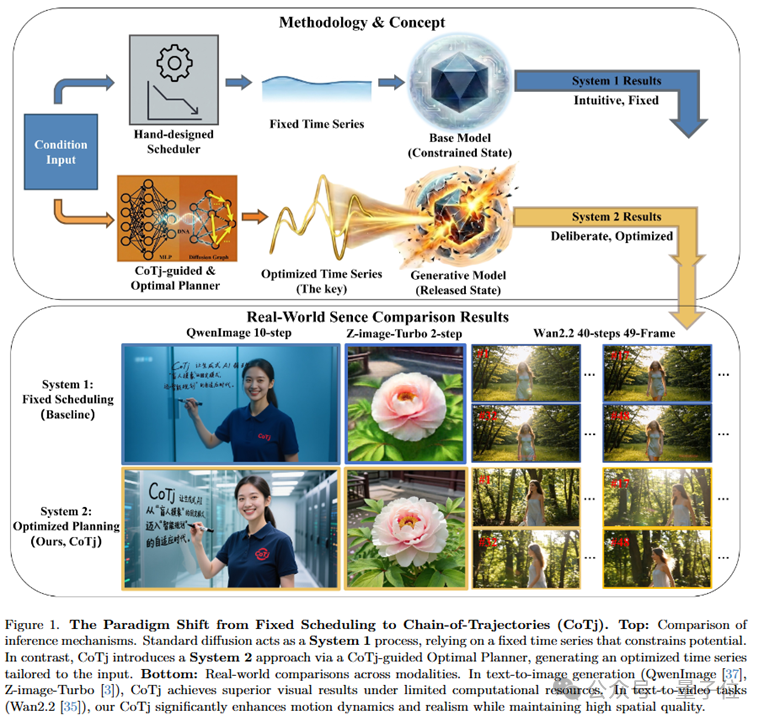 △ 上图直观展示了传统 System 1(固定调度)与 CoTj System 2(优化规划)的推理机制对比,以及在图像和视频生成上的真实效果差异。