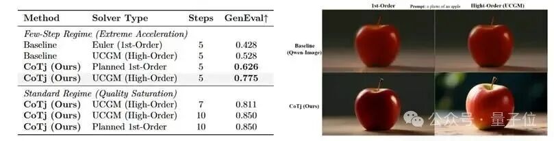 △ 5 步极端压缩下的视觉消融实验。只有基于 CoTj 规划轨迹的方法(下方两图)成功保住了苹果的几何结构和光影细节,证明 “找对路” 比单纯提升求解器阶数更关键。