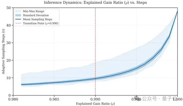 △ 增益比(ρ)与自适应步数关系。基于 25,432 条提示统计,在 ρ≈0.99 附近出现明显相变,此后步数需求超线性上升、边际收益递减,验证了 “接近最优重建即终止” 的准则。