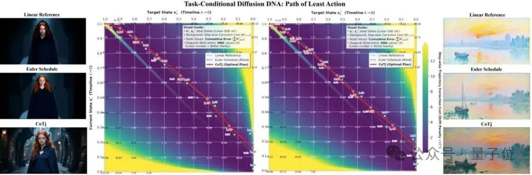 △ 在漂移惩罚的转移成本热力图中,CoTj(红实线)能自适应找到 “最小作用量路径”,而传统 Euler 调度(蓝虚线)在低误差区域浪费大量步伐,高误差区采样不足。