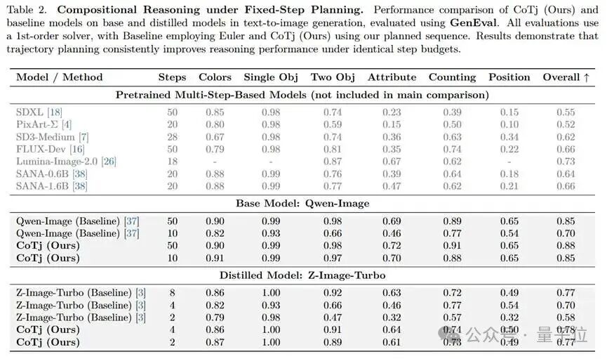 固定步数:在固定采样步数预算下,通过图规划选择最适配当前条件的最优去噪轨迹。实验结果显示,在 Geneval 指标中,无论是基础模型还是蒸馏型文生图模型,CoTj 均显著提升了生成准确性,同时实现有效加速。