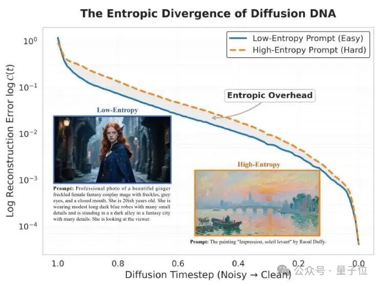 △ 如图所示,低熵(简单)和高熵(复杂)的提示词在生成难度和误差曲线上存在显著差异,Diffusion DNA 能够完美捕捉这种内在的异质性分布。