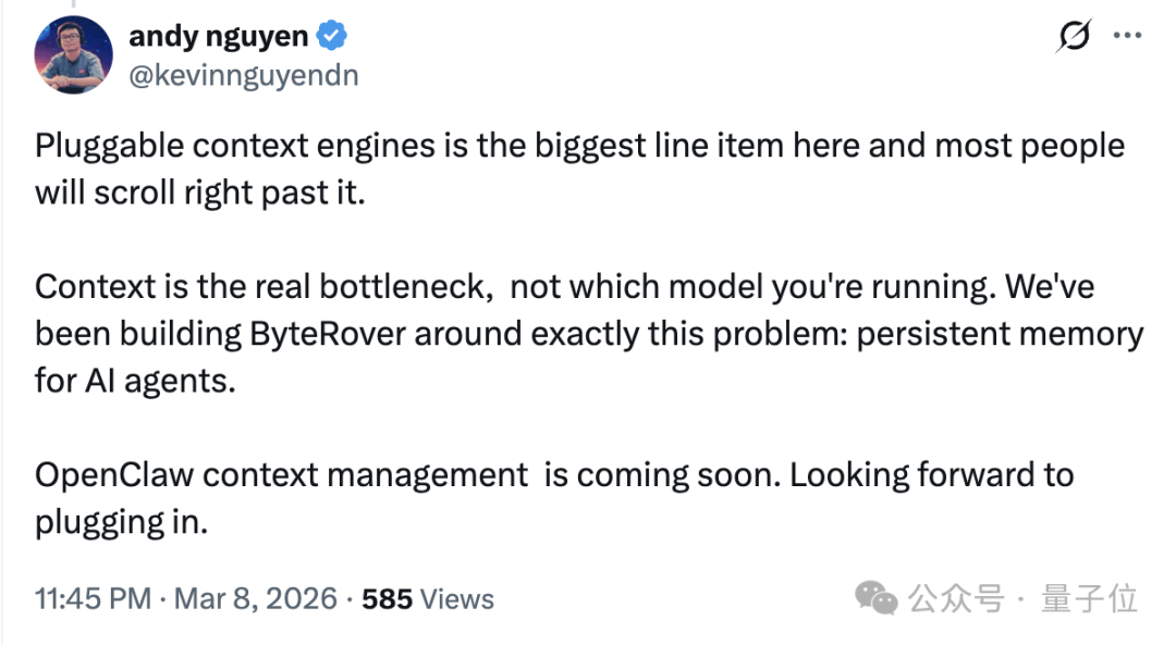 其中,可插拔的上下文引擎被网友评为 “本次更新最大亮点”,不少开发者直言:“相比于纠结跑哪个模型,上下文管理才是 Agent 的真正瓶颈。”