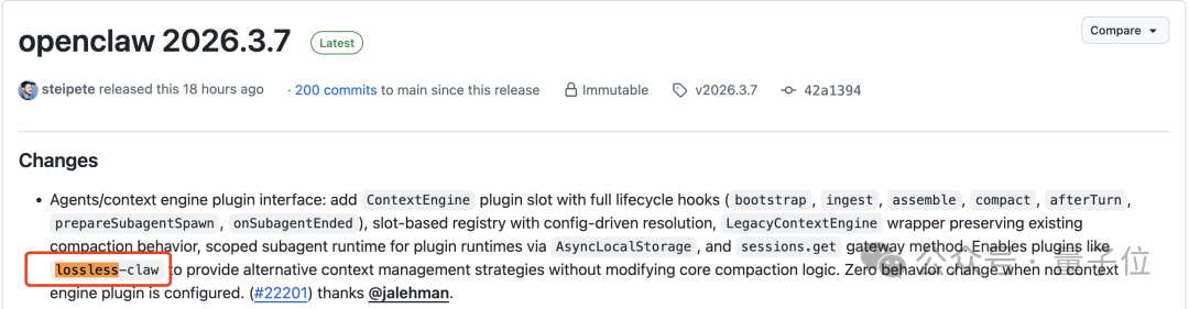 细心的用户还发现,官方更新日志中直接点名了一款插件案例 ——lossless-claw,它正是上下文引擎插件化的典型应用。