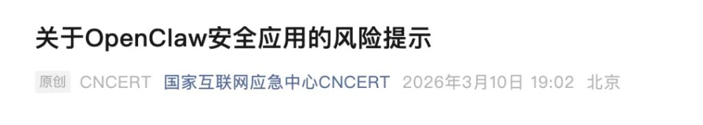 同日,国家互联网应急中心发布关于OpenClaw安全应用的风险提示: