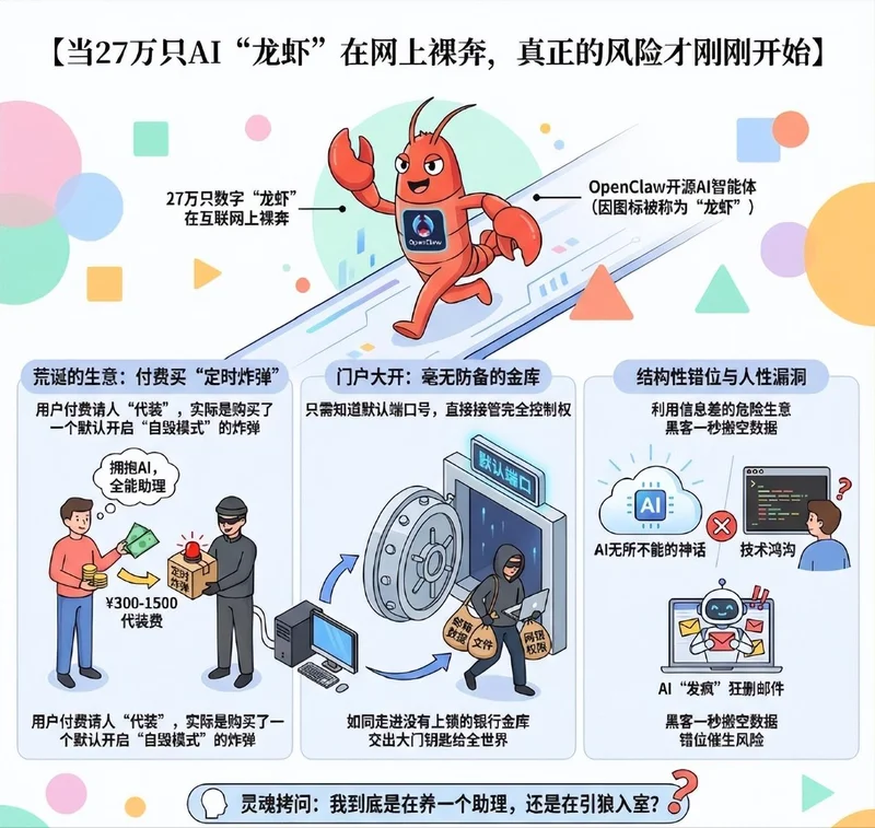 网络安全专家警告,一旦被黑客入侵,“一秒就可以搬空”。据媒体报道,截至目前被扫描出的“裸奔”龙虾数量已高达27万只。
