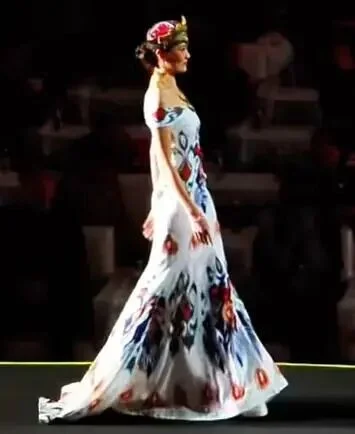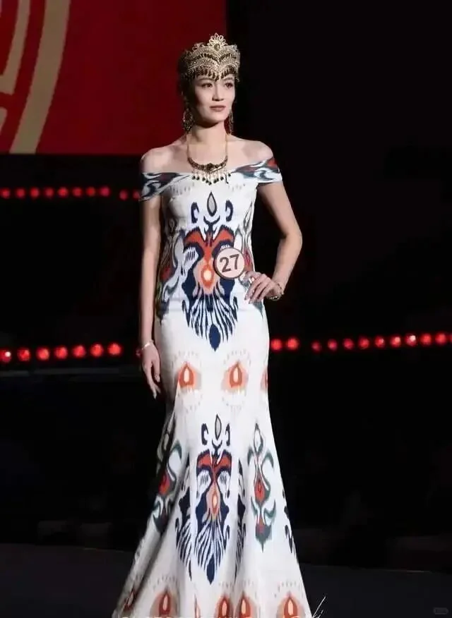 关于时尚与服装,这位20岁的姑娘有自己的独特见解。在总决赛的国服风华秀环节中,艾柯莱・艾山江并没有选择常规的礼服,而是上身了与母亲共同设计的国服风华秀艾德莱斯绸定制鱼尾裙,佩戴颇具民族特色的头冠、耳环与项链惊艳亮相。