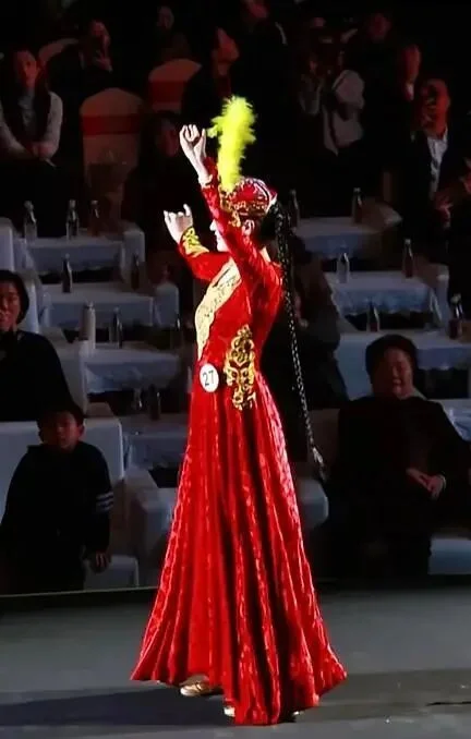 个人才艺展示中,艾柯莱・艾山江同样选择了民族服饰,一身维吾尔族传统红色丝绒刺绣盛装极为明艳,佩戴着维吾尔族传统银质镀金花冠和黄色鸵鸟毛装饰,在暖光下格外耀眼,舞动时鸵鸟毛轻轻摇晃,与音乐节奏完美契合,现场感染力直接拉满。