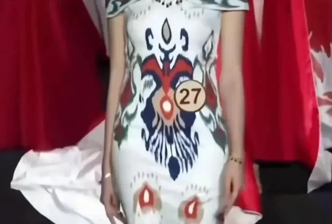 这条长裙融入了喀什正宗的艾德莱斯绸灵动纹样,廓形采用了现代长裙剪裁,将古老的纹样与当代的时尚审美相结合,而这件承载了亲情与文化的战衣,更是被评委盛赞 “全场最具文化分量的造型”。