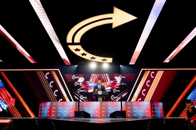 万斯于去年12月在“美国转折点”的峰会上。卢比奥于3月2日在国会大厦向记者发表讲话。Cheney Orr/Reuters; Anna Moneymaker/Getty Images