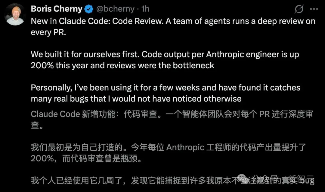 Claude Code之父重磅官宣:Claude Code新增代码评审(Code Review)新功能。
