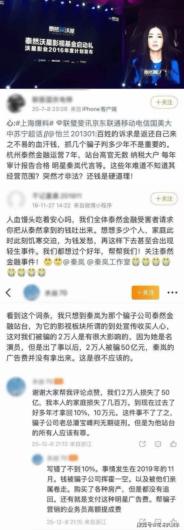 除了医美投资翻车,秦岚还被指为问题美妆品牌站台,利用自身明星光环参与虚假宣传。而最严重的当数她代言金融诈骗公司的旧案重提。她曾担任泰然沃星影视基金的代言人兼投资顾问,该基金背后的泰然金融涉嫌非法吸收公众存款超50亿元,导致两万多名受害者倾家荡产,实际控制人已被判处无期徒刑。如今受害者纷纷在网上发声,指责秦岚作为既得利益者,拿高额代言费却从未对受害者进行补偿,怒斥其吃人血馒头。