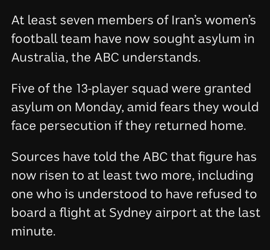 而其他伊朗女足球员则和队伍一起,在今日早些时候从布里斯班机场飞往悉尼,然后计划从悉尼飞往亚洲,再在未来几天经第三国由陆路入境伊朗。