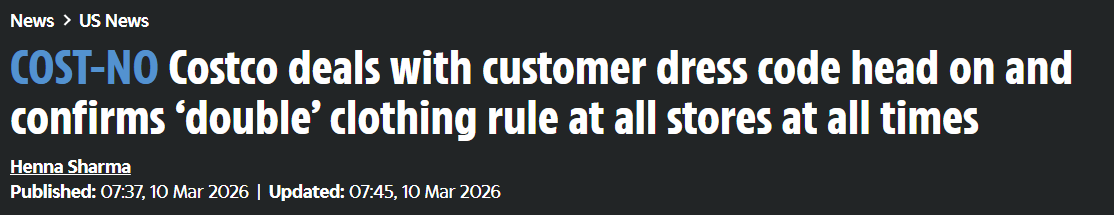 美国大型仓储式连锁超市Costco近日明确回应顾客关于门店着装要求的疑问,确认所有门店均实行一项严格的“双重着装”规定,顾客在店内必须同时穿衬衫和鞋子。