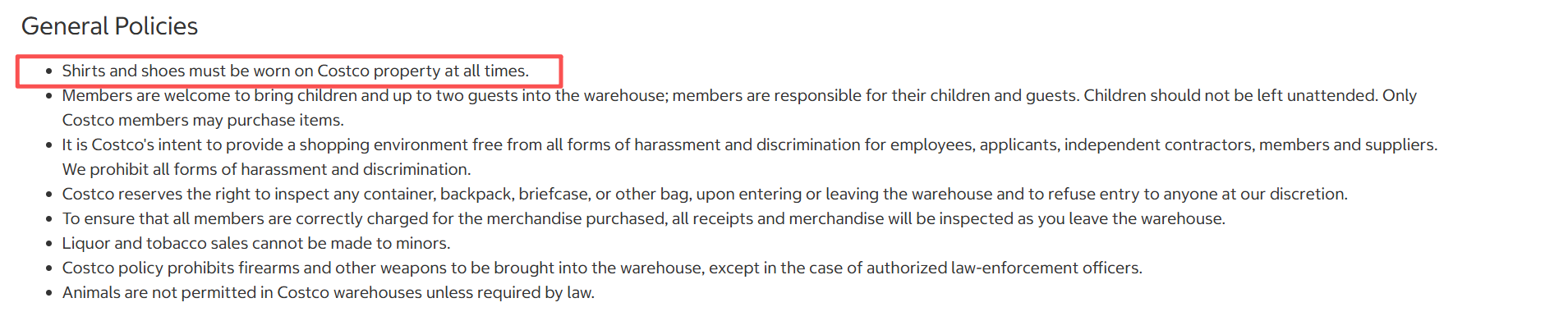 Costco在官网政策中写道:“在Costco物业范围内,顾客必须始终穿着衬衫和鞋子。”