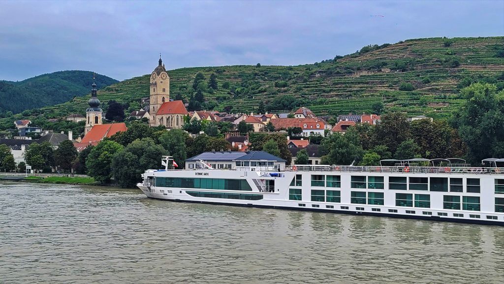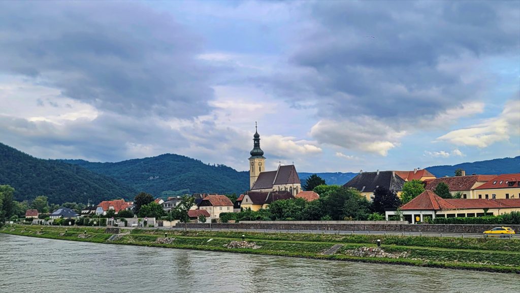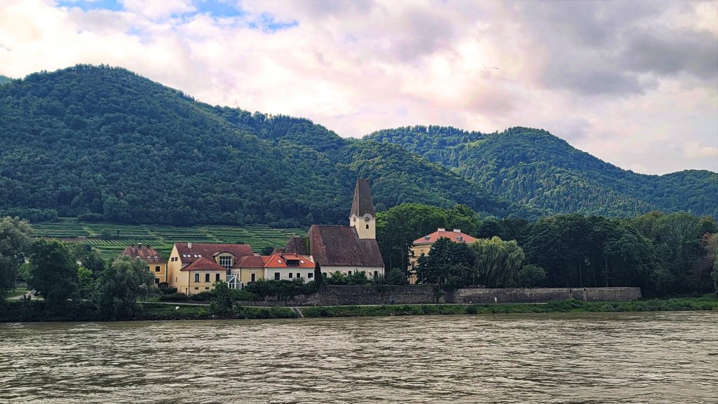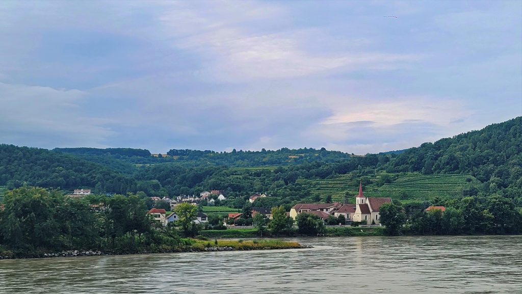 多瑙河畔施瓦伦巴赫村的风景,引人注目的教堂是施瓦伦巴赫的圣西吉斯蒙德教堂.