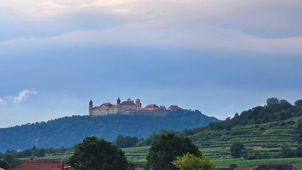 远处的格特维格修道院(Göttweig Abbey)坐落在俯瞰瓦豪河谷的山丘上