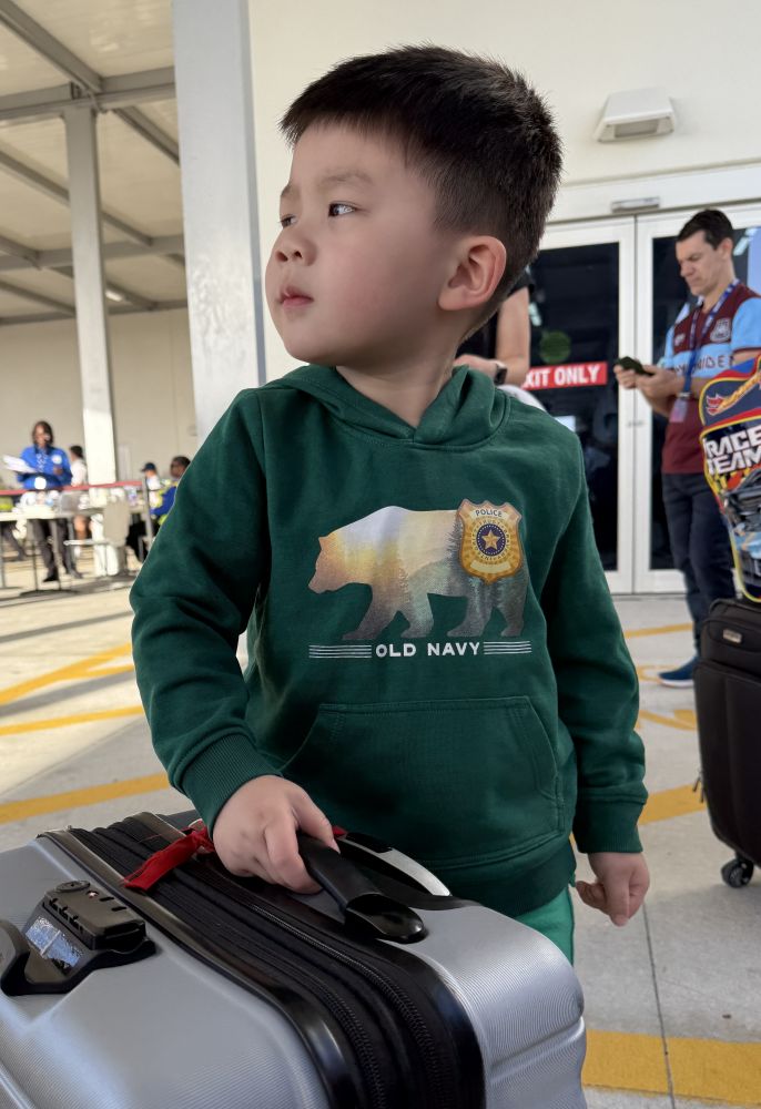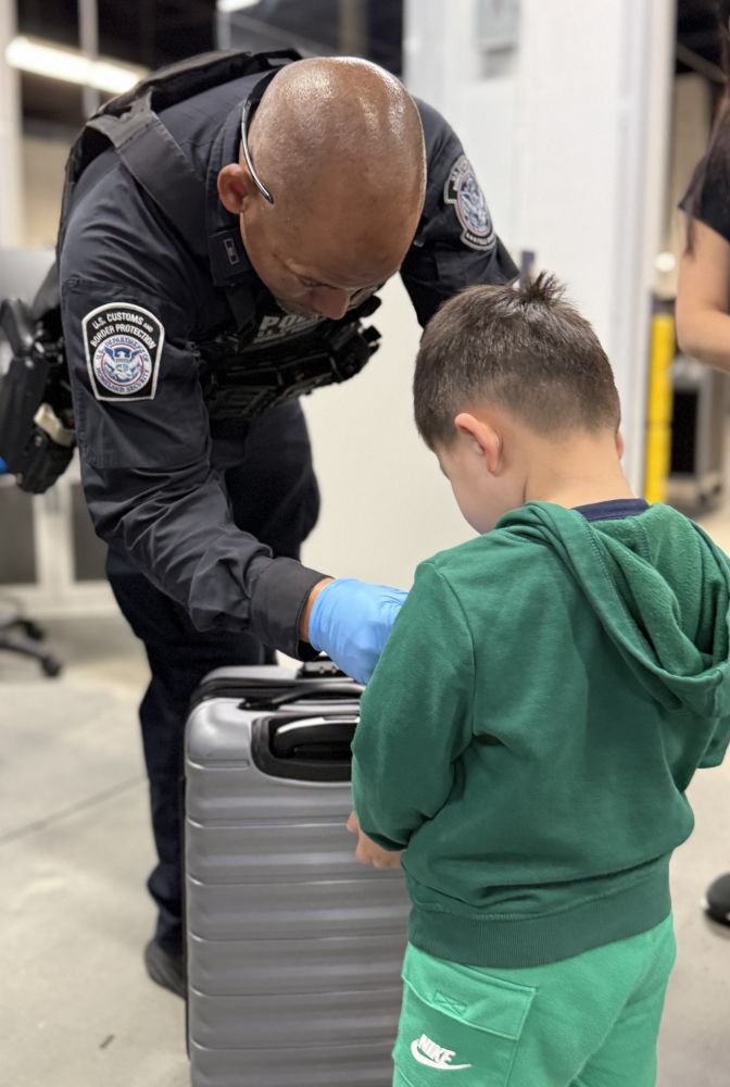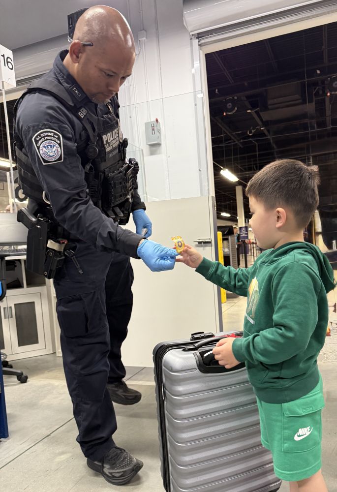 全副武装一脸严肃神态的美国边检官站在柜台一一检查了我们的护照,还回护照后友好地说了声have a good day. 这时俺家的小社牛对着边检官竖起了大拇指,笑着说,you did a good job. 把警察逗乐了,我们一家正要离开时,这个边检官对我们说,等一下,我去拿个东西送他,说着走向不远处他的办公桌,从里面拿出一卷贴纸,原来是送给小朋友的警察徽章。 亲自给带上。 出来看人的神情都不一样了...