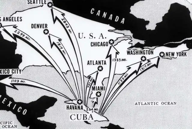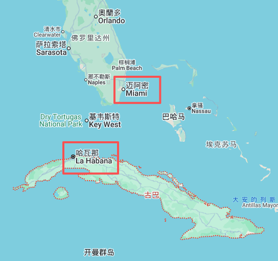 假如你现在从哈瓦那一路往北,就能到迈阿密。中间只隔着佛罗里达海峡,最窄的地方也就150公里左右。这约等于北京到天津的距离,坐飞机还不到1小时。
