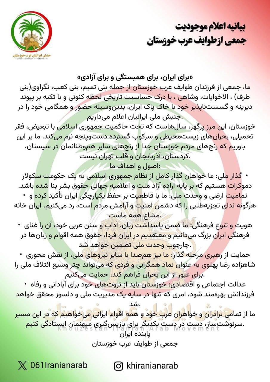 “这是一份伊朗阿拉伯人的民族宣言。库兹斯坦这个大型边境省份,多年来在伊斯兰共和国政权统治下,遭受严重的物资短缺、歧视、军事封锁、压迫与软性控制。我们认为,这些危机与压迫被强加于我们身上。在库兹斯坦人民心中,阿瓦士(Ahvaz)、阿巴丹(Abadan)等城市才是我们的心脏与灵魂,而不是德黑兰。”