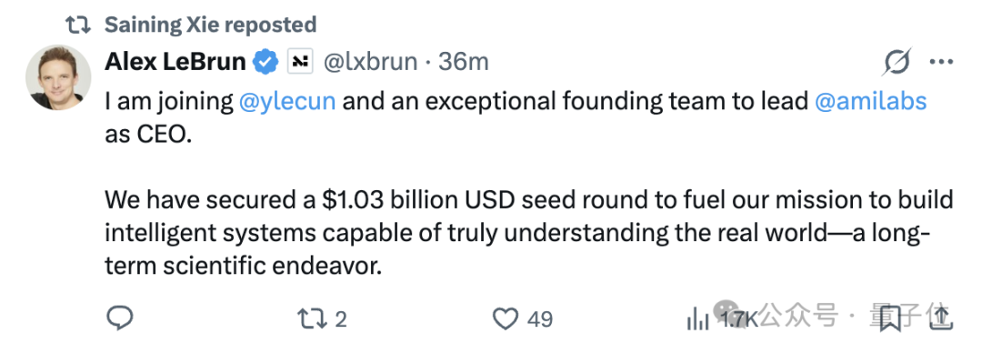 就在不到一个月前(2 月 18 日),李飞飞教授的世界模型公司 World Labs 宣布以 50 亿美元估值融资 10 亿美元。而今天,AI 教父 Yann LeCun 的世界模型公司 Advanced Machine Intelligence(AMI)也官宣融资 —— 金额达到 10.3 亿美元,比前者还多出 3000 万美元,成立仅两个半月,一举刷新世界模型初创公司融资的最高纪录。