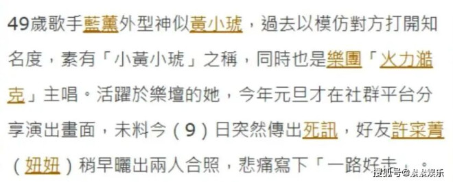 著名女歌手蓝薰因心肌梗塞离世,年仅49岁!