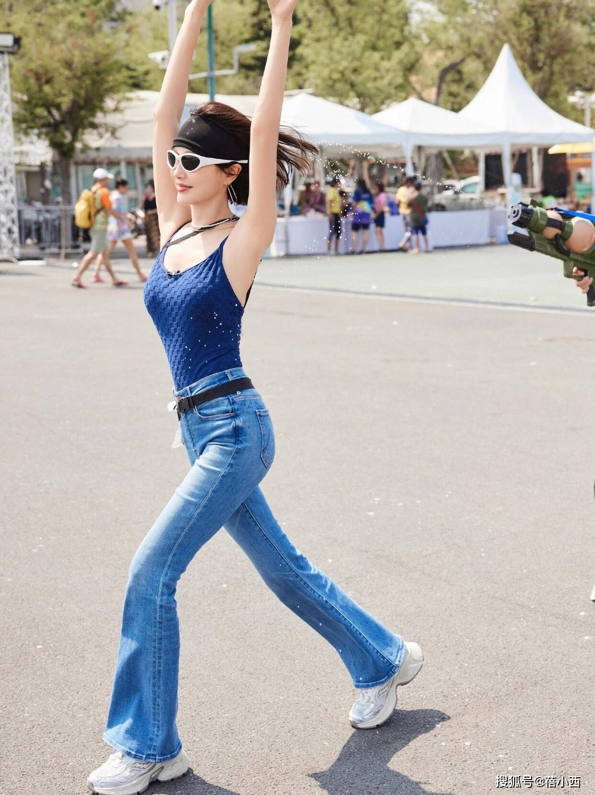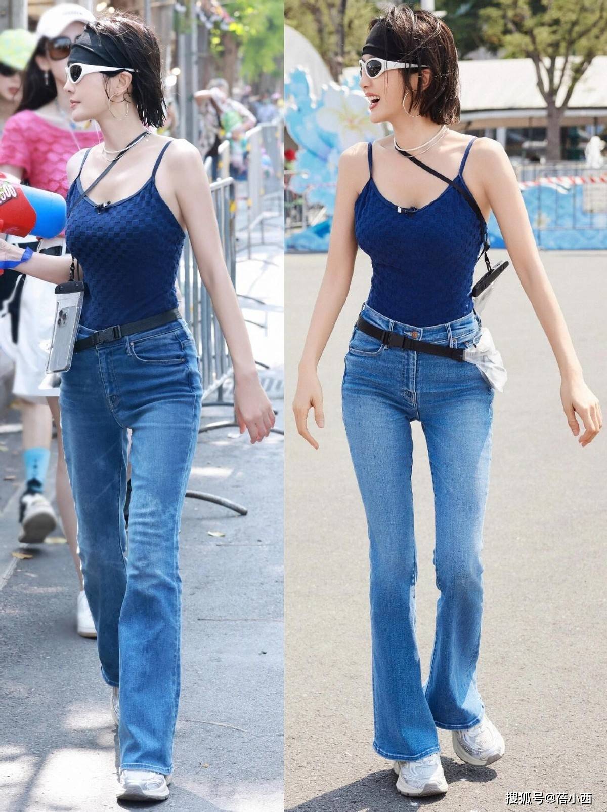 今年不知道为什么,流行起来了泳衣外穿的风格。但还别说,泳衣穿在秦岚的身上还是很好看的。其实很多常规款的泳衣和吊带的设计是差不多的,只不过泳衣的包裹性更强一点,面料会更有弹性,因此也更加的显身材。秦岚的这件泳衣是深蓝色,和她的冷白皮形成了鲜明对比,也衬得她肤色更加白皙。