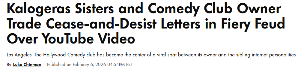 随后,Hollywood Comedy Club向Kalogeras姐妹发出停止侵权通知,要求她们删除视频。通知中写道:“很明显,Kalogeras姐妹并不在乎道歉。她们得到了自己想要的——可以被用来赚取点击量的‘内容’。”