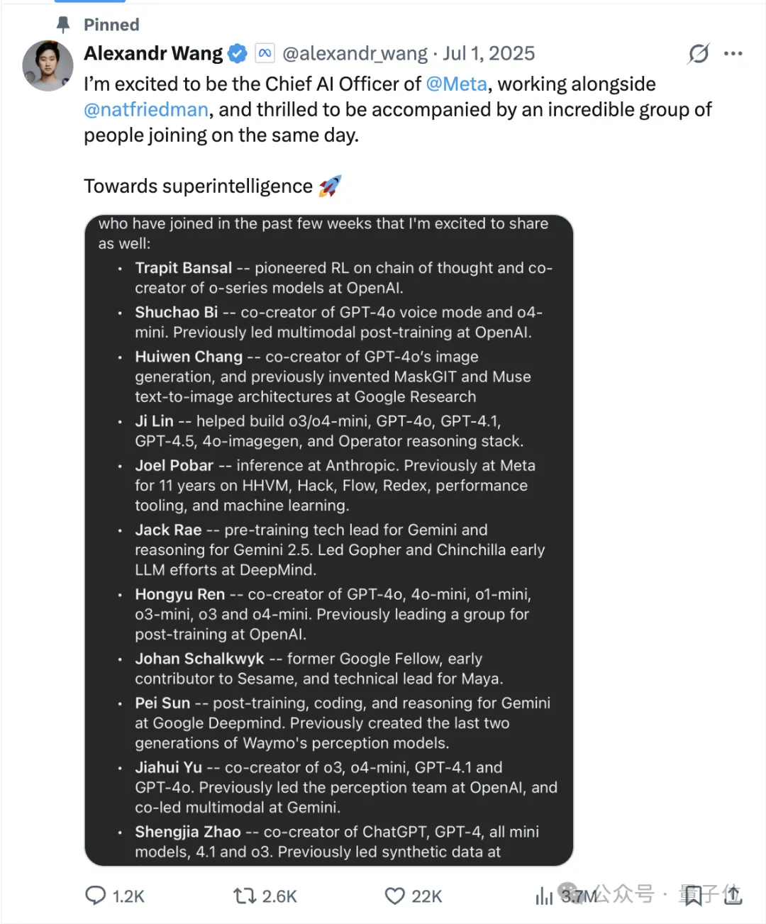 他在X上的置顶帖,依然是去年7月宣布加入Meta的那条。