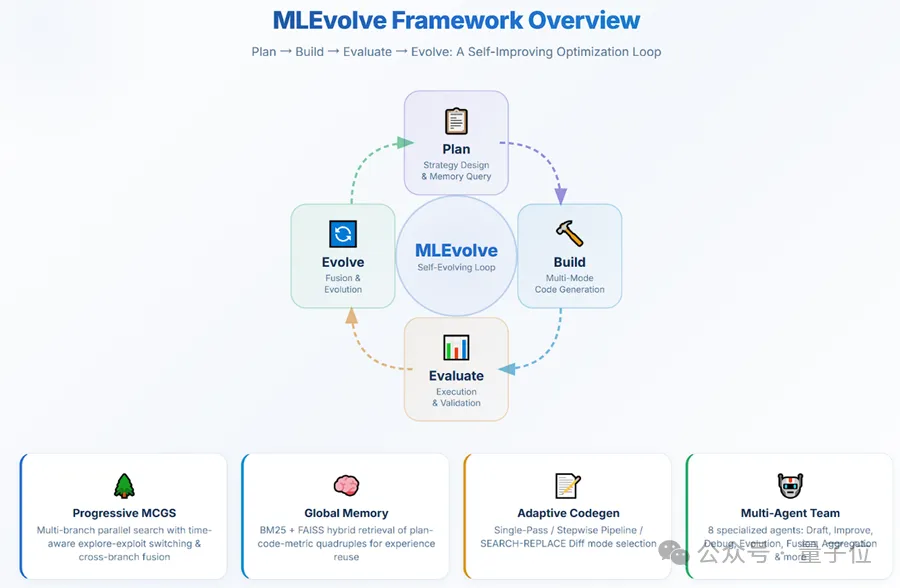 MLEvolve的核心理念是:在长周期自动化任务中,系统不应止步于生成一个方案,而应持续搜索、验证与精进。MLEvolve将”规划→构建→评估→进化”编织为一个可重复的优化闭环,让智能体在有限预算内不断逼近更优解。