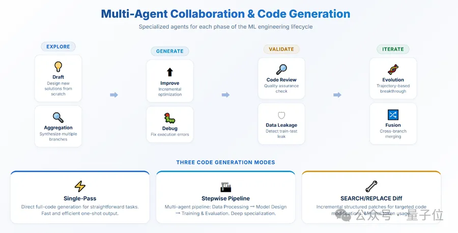 在协作层面,MLEvolve构建了一支覆盖ML工程完整生命周期的多智能体团队,涵盖方案设计、迭代优化、错误修复、代码审查、数据泄露检测等关键环节。系统根据当前搜索状态自动调度最合适的Agent——探索阶段由草稿Agent开拓新方向,瓶颈时由进化与融合Agent突破局限,全程由审查Agent保障代码质量。这种专业化分工与动态调度机制,使得整个系统如同一支高效运转的AI工程团队。