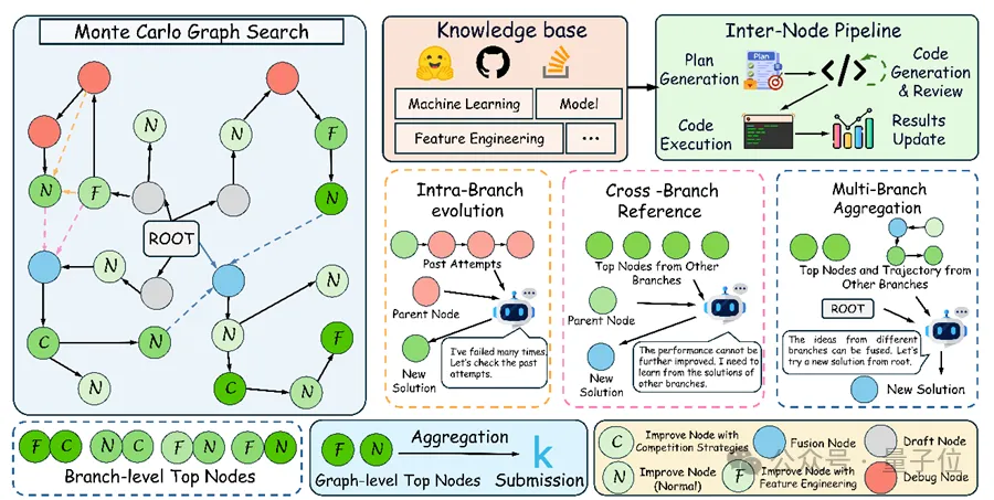 MLEvolve的核心是一套自进化机器学习系统。它用渐进式蒙特卡洛图搜索替代传统树搜索,让不同尝试路径之间实现经验互通;用全局记忆层记录每一次成败,让智能体越探索越聪明;还用多模式代码生成和多智能体协作,覆盖从方案设计到代码审查的全流程。