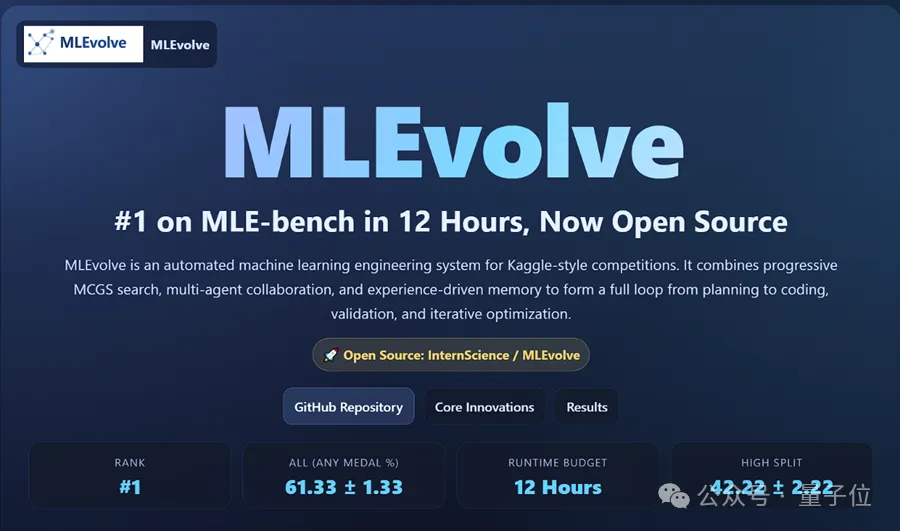 上海AI实验室「书生」科学发现平台最新开源的MLEvolve给出了答案:12小时登顶MLE-bench榜单第一。