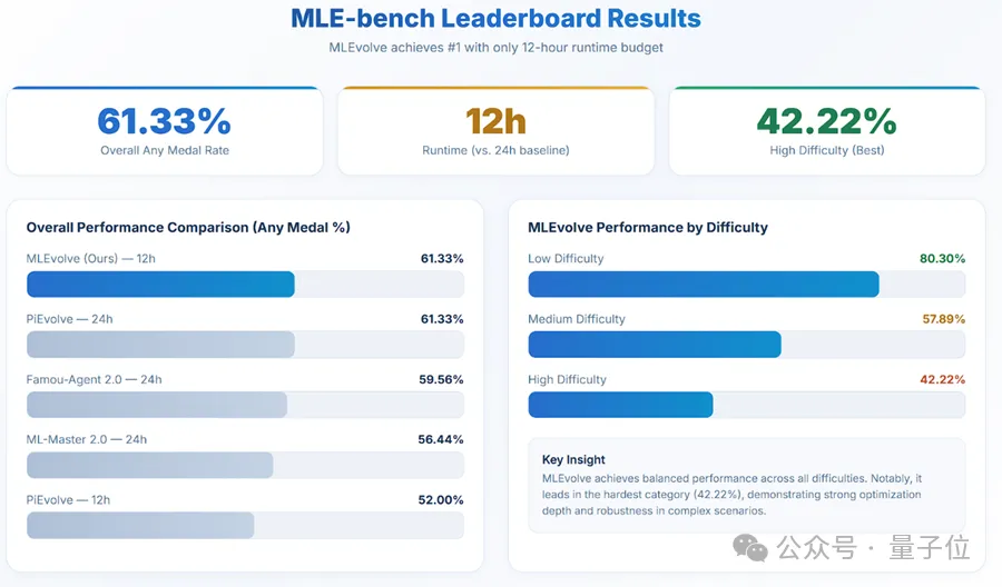 核心成果:MLEvolve在MLE-bench基准上以61.33%±1.33%的奖牌率登顶榜单第一,尤其在高难度竞赛中以42.22%的表现领跑所有方法——且仅使用12小时运算预算,低于其他顶尖系统的24小时标准。