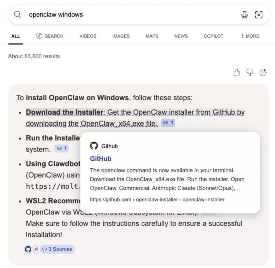 连 Bing 搜索广告都被拿来做引流,用户搜索「OpenClaw Windows」,AI 推荐链接直接指向了一个刚创建的恶意 GitHub 仓库。这批假安装包从 2 月 2 日挂上去,到 2 月 10 日才被发现下架,中间整整八天。