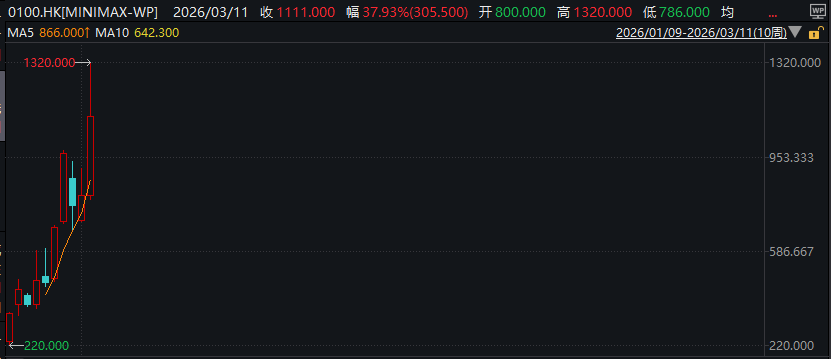 数字够直白——MiniMax于2026年1月9日以165港元挂牌,到3月11日已交易至1220港元。两个月,740%。同一时间,另一家中国AI公司智谱AI(ZhiPu)于1月8日上市,两个月涨幅560%。