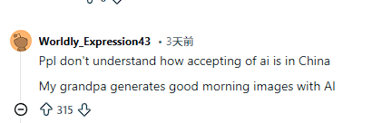 大洋彼岸的美国Reddit论坛上,有位网友说,他爷爷每天早上用AI生成问候图片发家族群。另一位用户直接一针见血:"你们不懂AI在中国有多被接受。"