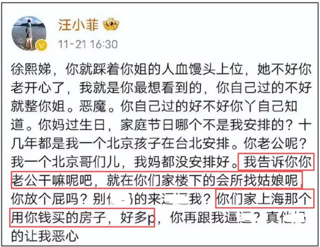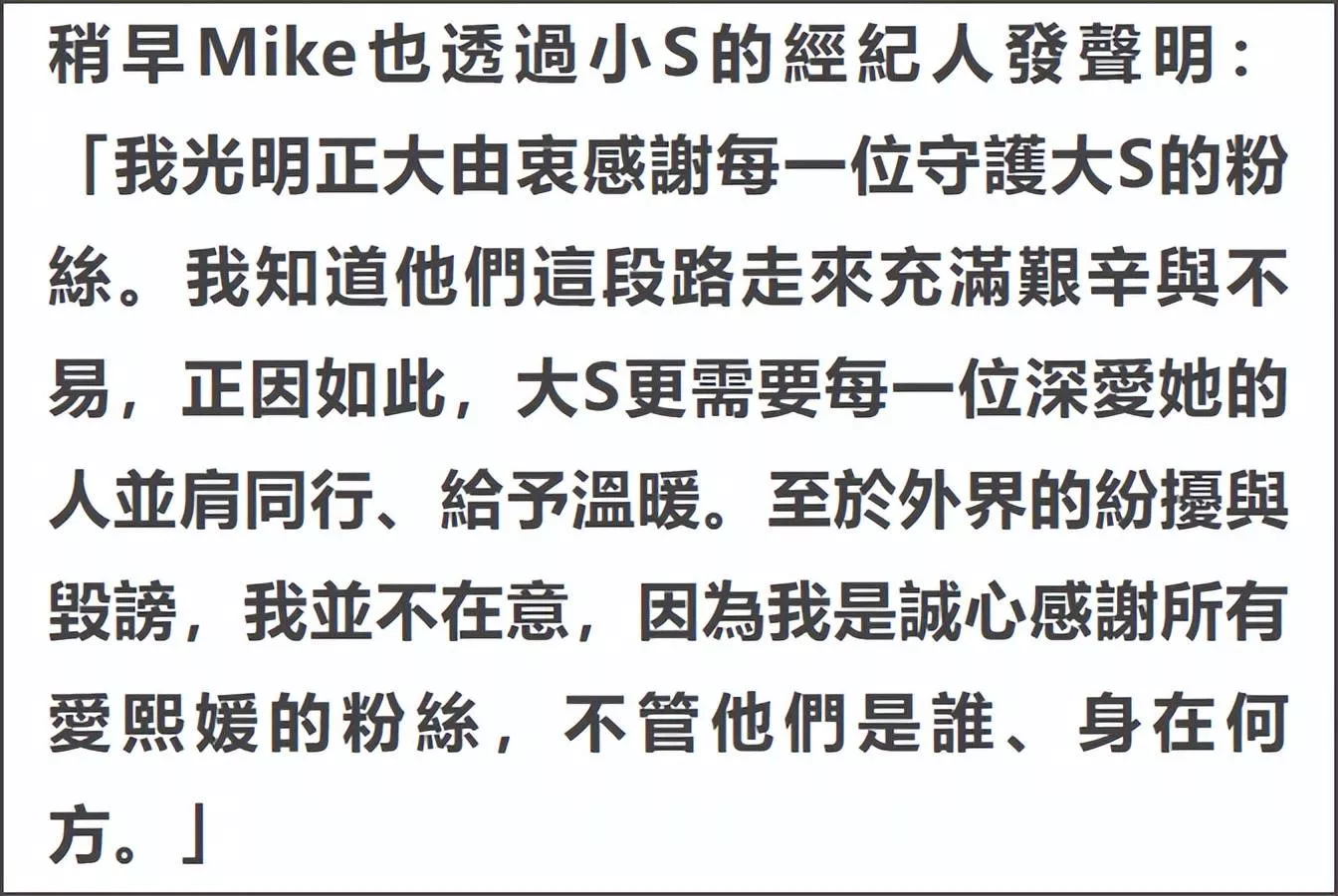 此前还有传闻,大S去世后,小S没人撑腰,许雅钧打算和小S离婚,让私生子认祖归宗,如果小S不答应就会净身出户,而小S始终未对此类传闻做出回应。
