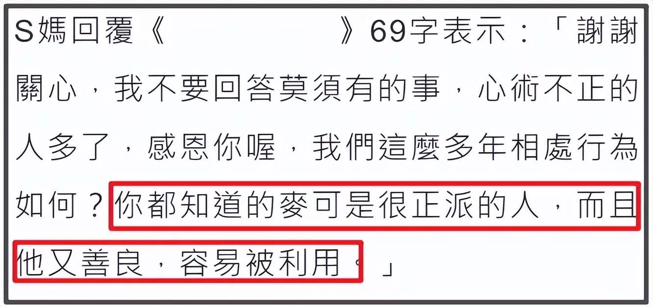 不仅小S力挺,S妈也力挺女婿,说许雅钧是很正派的人,又善良,容易被利用。