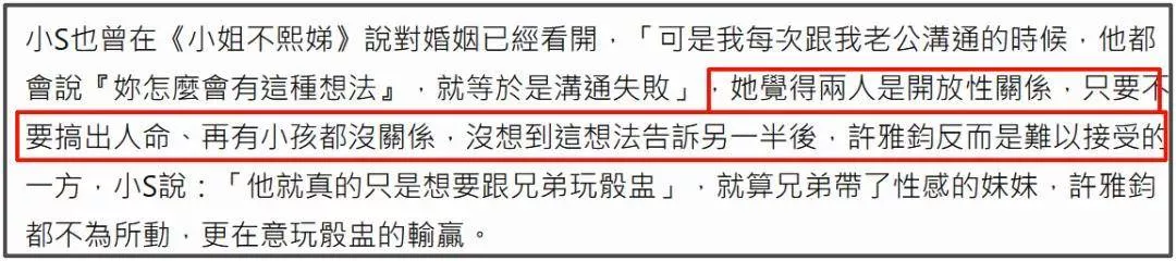 但就在许雅钧有私生子的传闻发酵后,两人的婚姻状况似乎就不太对劲,两年前小S更是直言,许雅钧对她彻底失去兴趣,连接吻都不愿意。感冒的借口用了好几次,就是躲她,甚至宁愿睡客厅。