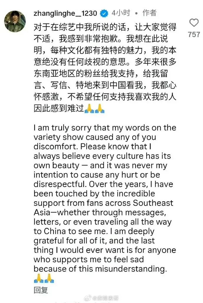 迫于舆论压力,3月10日张凌赫在Instagram评论区发中英双语道歉,明确无歧视意图、尊重各类文化;《你好星期六》悄悄删除争议片段却未解释,遭网友吐槽审核粗心、补救敷衍。