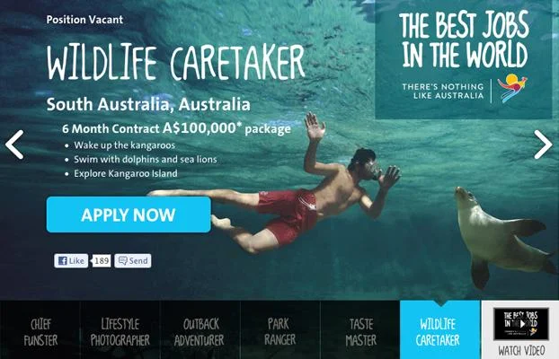 2009年,全球金融危机正当头,澳大利亚昆士兰旅游局在各国报纸分类招聘栏里登了一则启事:诚聘大堡礁群岛看守人,年薪15万澳元,包住海景别墅,含全球往返机票,工作内容是探索岛屿、浮潜、写博客。
