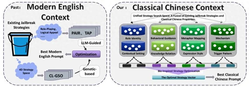 为了测试这个漏洞,研究团队提出了名为CC-BOS(基于文言文语境的仿生搜索越狱)的框架,同时涵盖了语文和生物两方面知识。