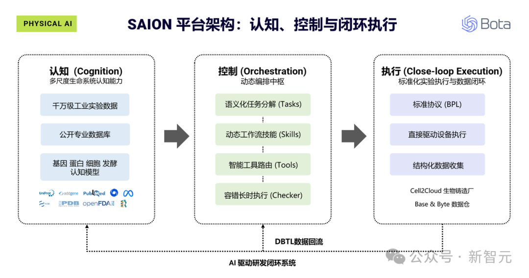 SAION AI 并非停留在虚拟设计的 AI 智能体或单一执行的实验自动化工具,而是一个包含认知、控制与闭环执行能力,能实现自主设计、直接参与并优化生物发现与生产工艺的 Physical AI 平台。