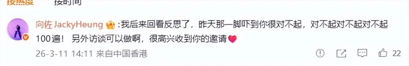 向佐也在评论区道歉:我后来回看反思了,昨天那一脚吓到你很对不起,对不起对不起对不起100遍! 另外访谈可以做啊,很高兴收到你的邀请。