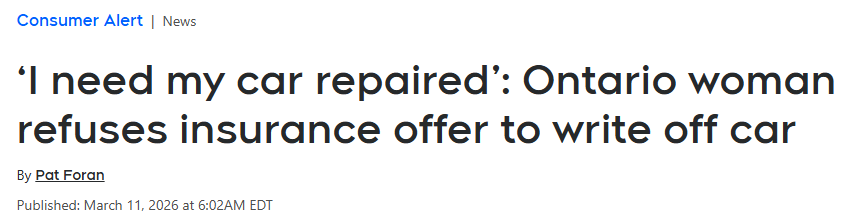 安省一名女子表示,她把车停在停车场里,回来时却震惊地发现自己的车卷入了一起肇事逃逸(hit and run)事故。虽然车辆外观损坏严重,但她仍然很惊讶——保险公司竟然拒绝维修,而是直接表示要把车“报废处理”。